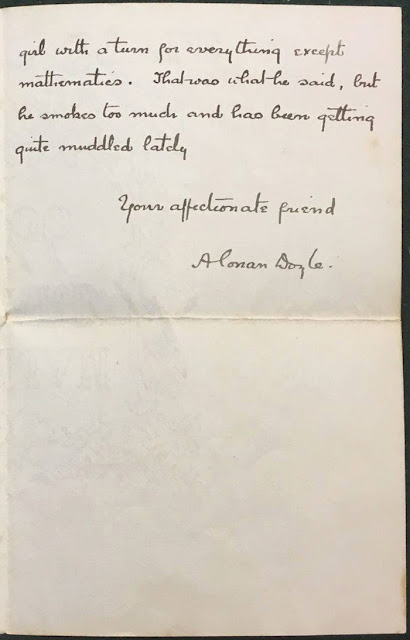 However, his reply to young Ruby indicates that he was far from done with Holmes. On the contrary, he demonstrated that the Holmes was alive and well in his mind through his own deductions (as elementary as they may have been). However, he seems to be preparing Ruby for what he know she'll inevitably discover that December, when the Strand Magazine would run "The Final Problem." Namely, that Watson takes up his pen to write "the last words in which I shall ever record the singular gifts by which my friend Mr. Sherlock Holmes was distinguished." Calling Holmes "muddled" gave him a bit of an excuse to allow Holmes to wane gracefully. And also note Conan Doyle's subtle warning about the dangers of smoking in this letter to a child.